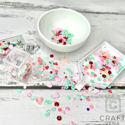 Mieszanka elementów ozdobnych do prac kreatywnych. Możesz je umieścić w shakerach, na kartkach, albumach, pracach mixmediowych itp.