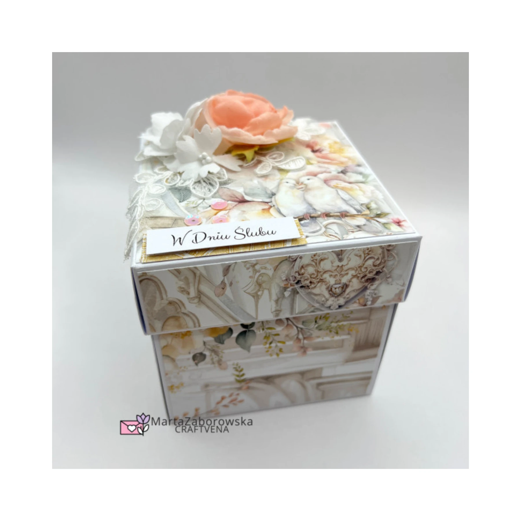 Na wieczku znajdują się ręcznie robione kwiaty oraz koronka, a całość uzupełnia napis „W dniu Ślubu”. Po zdjęciu wieczka ścianki pudełka opadają, ukazując starannie zaprojektowane wnętrze: