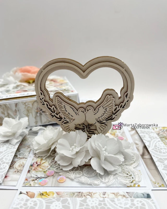 - trójwymiarowa tekturka z gołębiami – symbolem miłości i wierności,