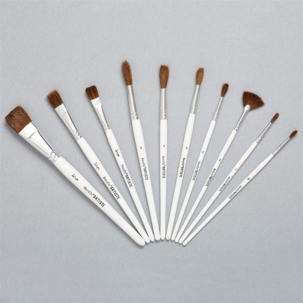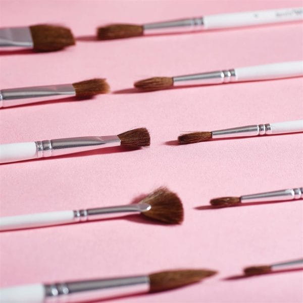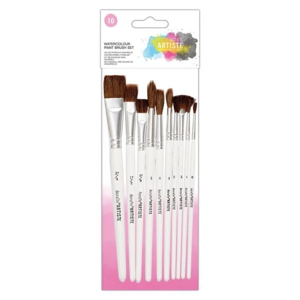 Zestaw 10 pędzli marki Docrafts. Białe trzonki, równe rozmiary i formy włosia, od płaskich po okrągłe.