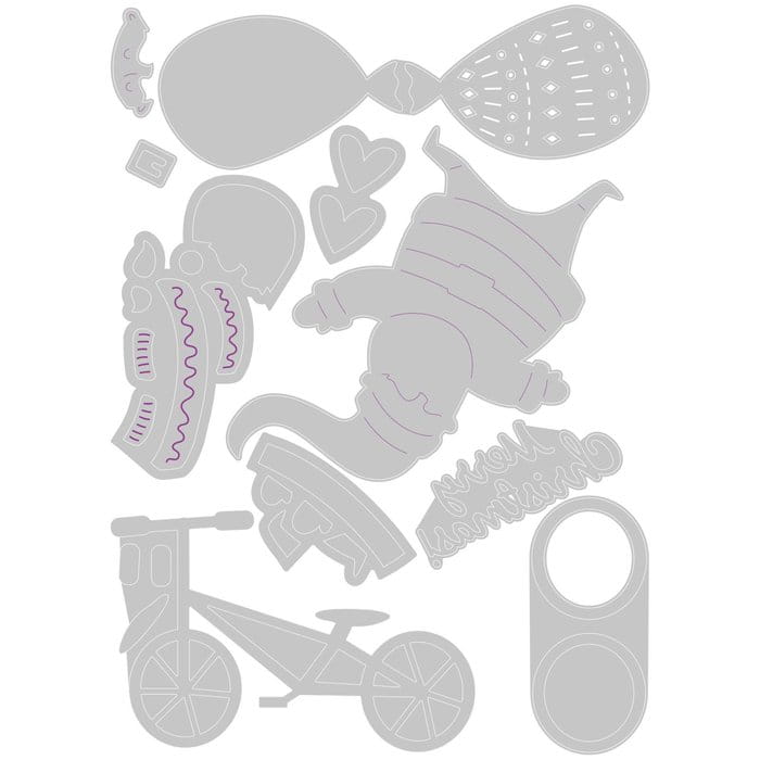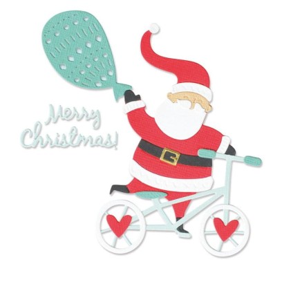 Wykrojnik marki Sizzix – Mikołaj na rowerze. Składa się z 10 elementów, więc Mikołaja można wykorzystać osobno, i podobnie rower, można użyć osobno