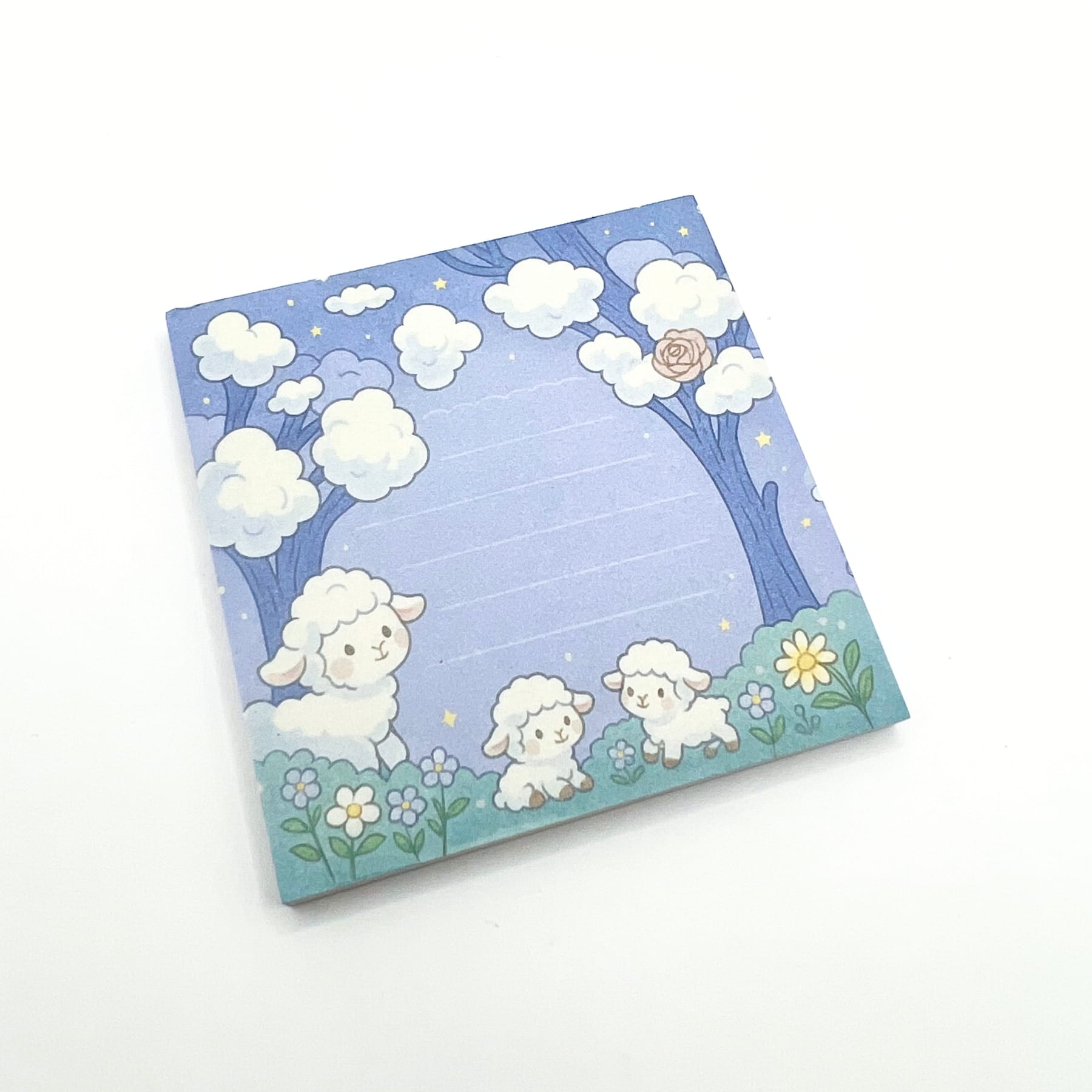 Kolorowe karteczki przylepne o wymiarze 7,5x7,5 cm, 50 arkuszy w bloczku. Z motywem owieczek, idealne do notatek, planowania i ozdabiania.
