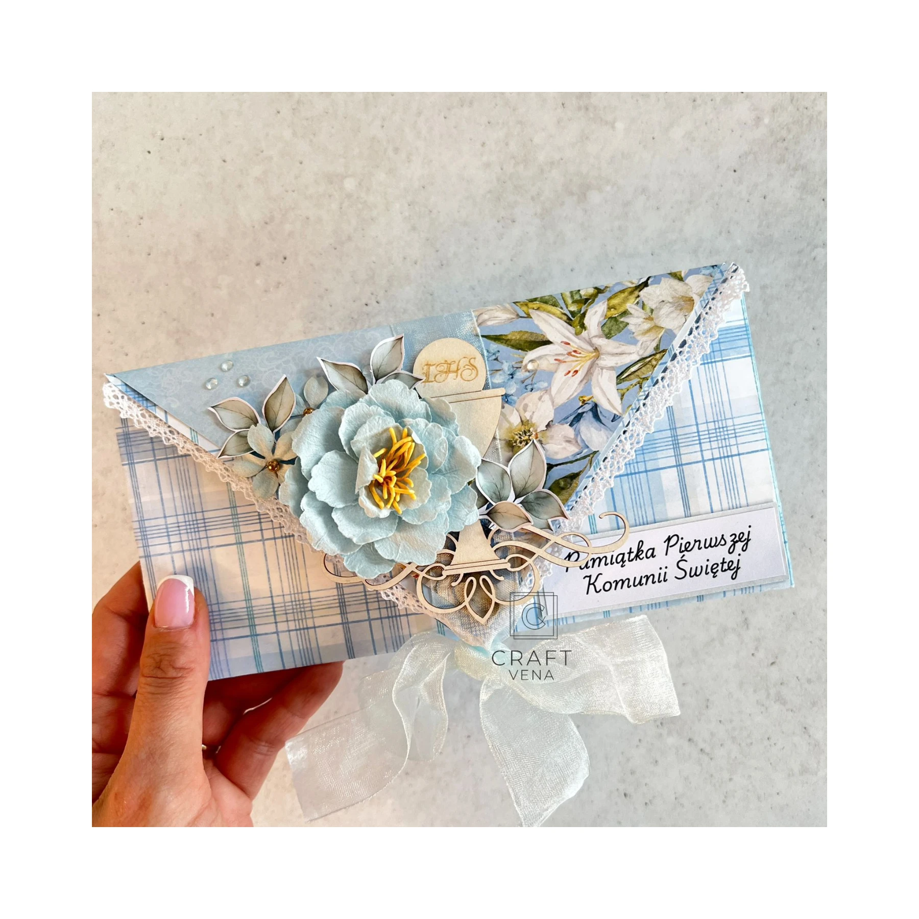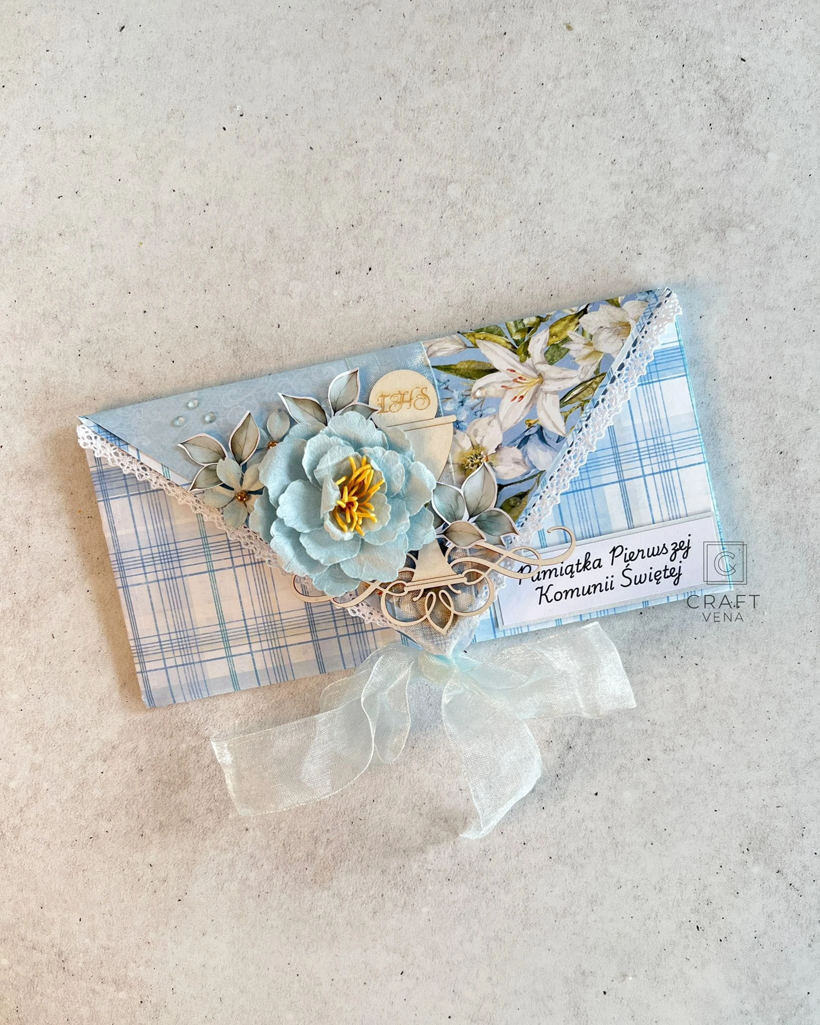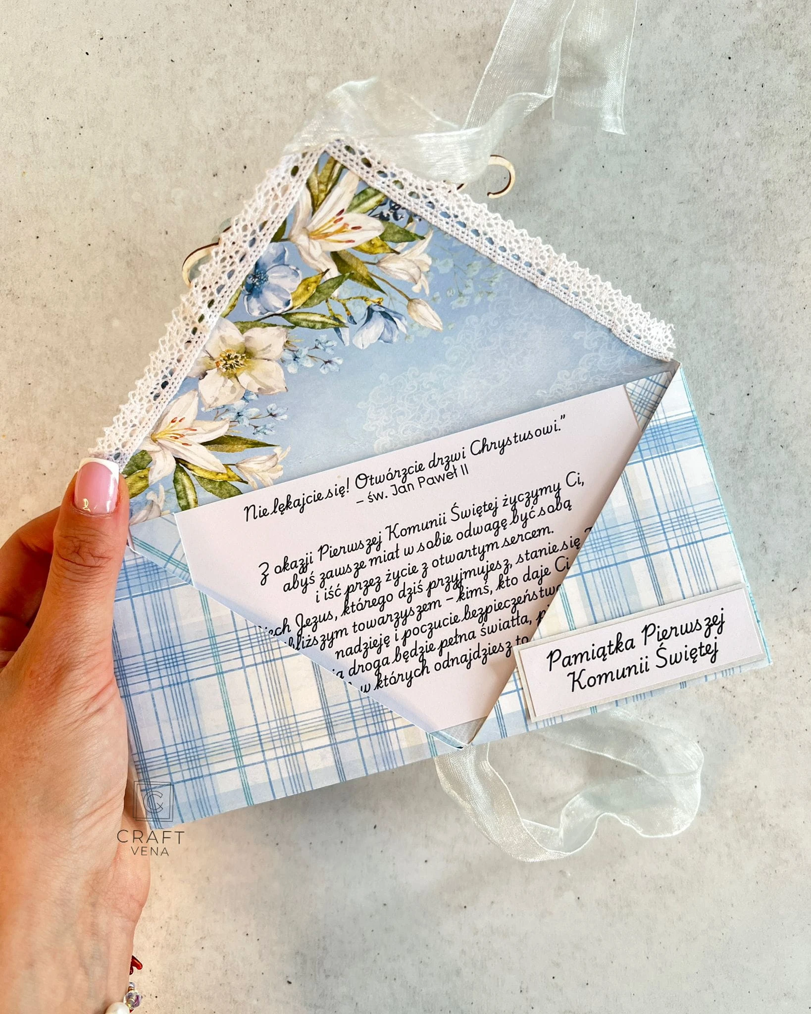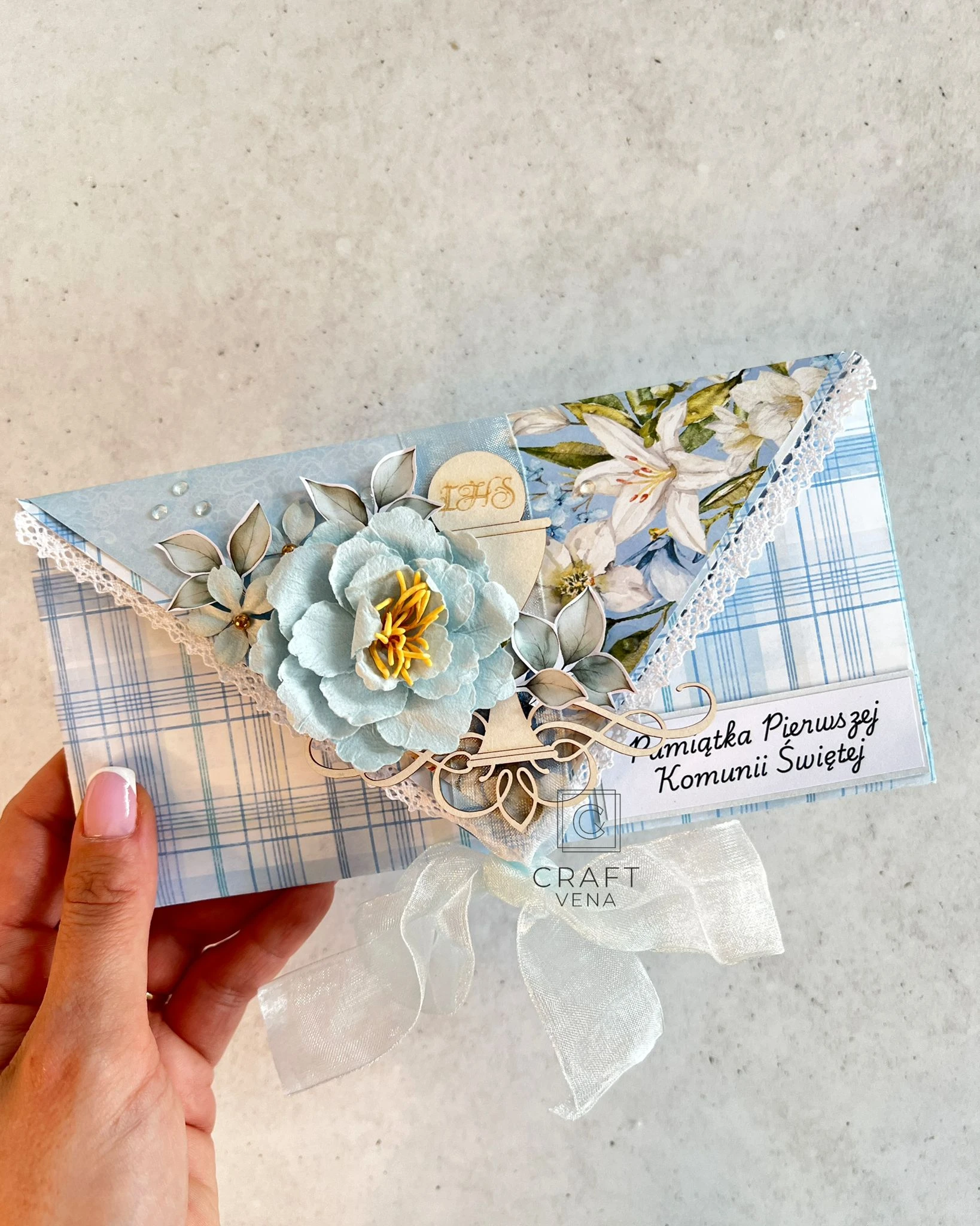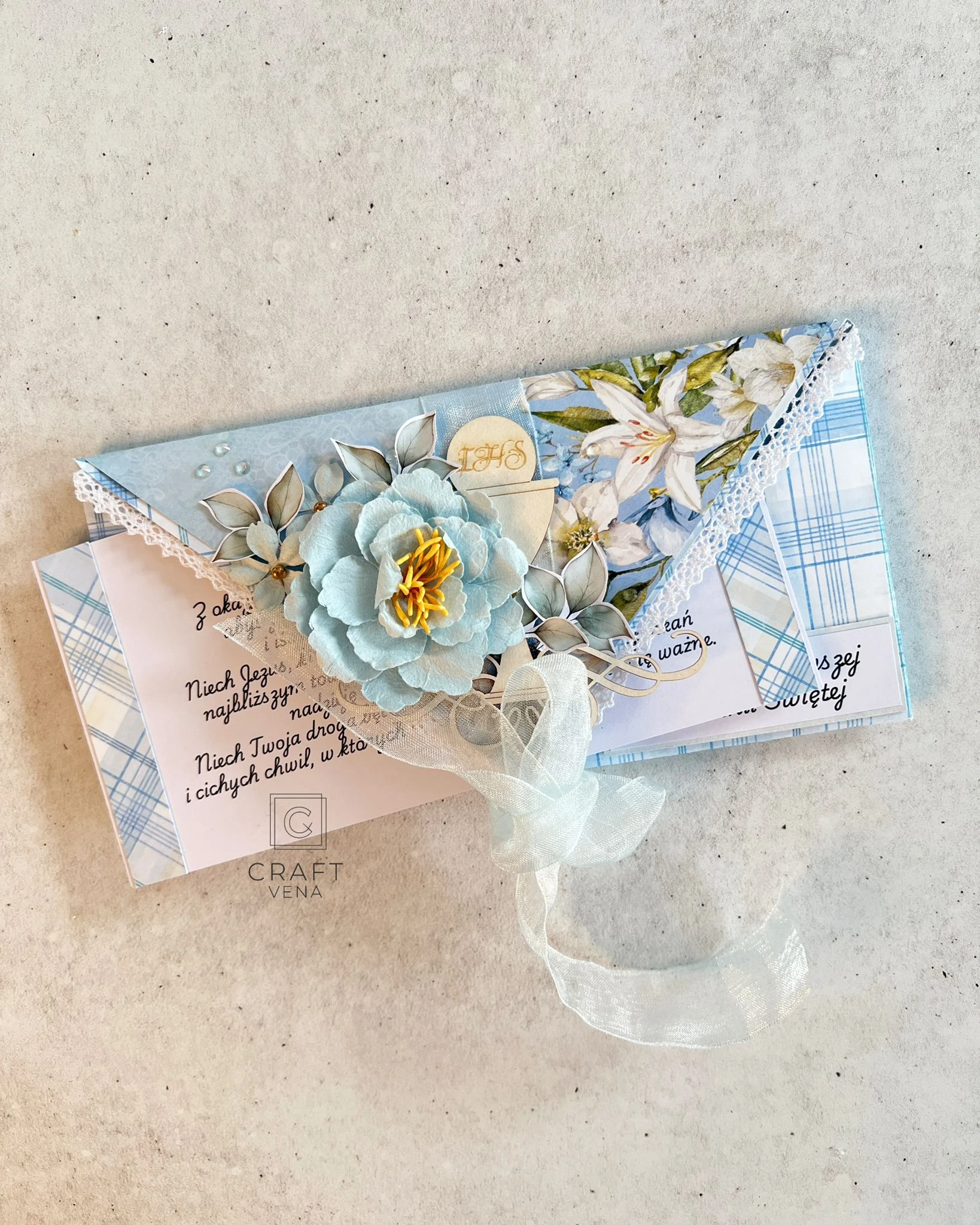 Wyjątkowa, ręcznie robiona kartka komunijna, w nietypowym formacie kopertówki. To mój autorski format, który wykonuję od wielu lat, i który cieszy się niezwykłą popularnością. Jest dla mnie charakterystyczny, niebanalny i zaskakujący.