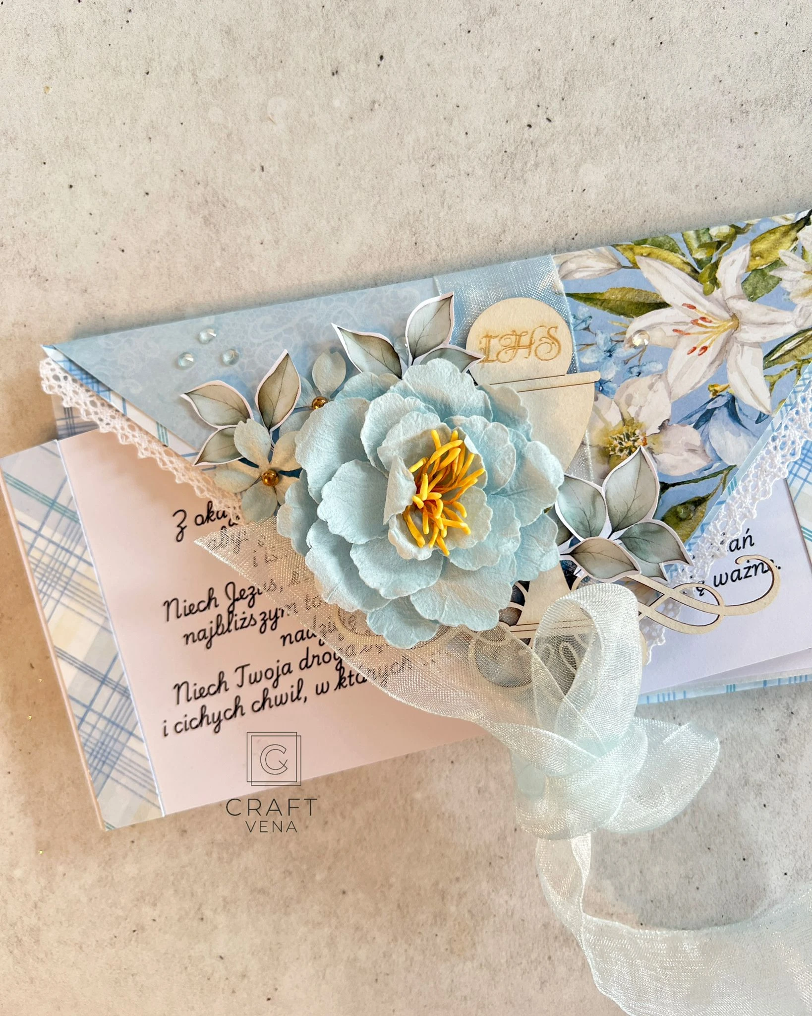 Wyjątkowa, ręcznie robiona kartka komunijna, w nietypowym formacie kopertówki. To mój autorski format, który wykonuję od wielu lat, i który cieszy się niezwykłą popularnością. Jest dla mnie charakterystyczny, niebanalny i zaskakujacy.