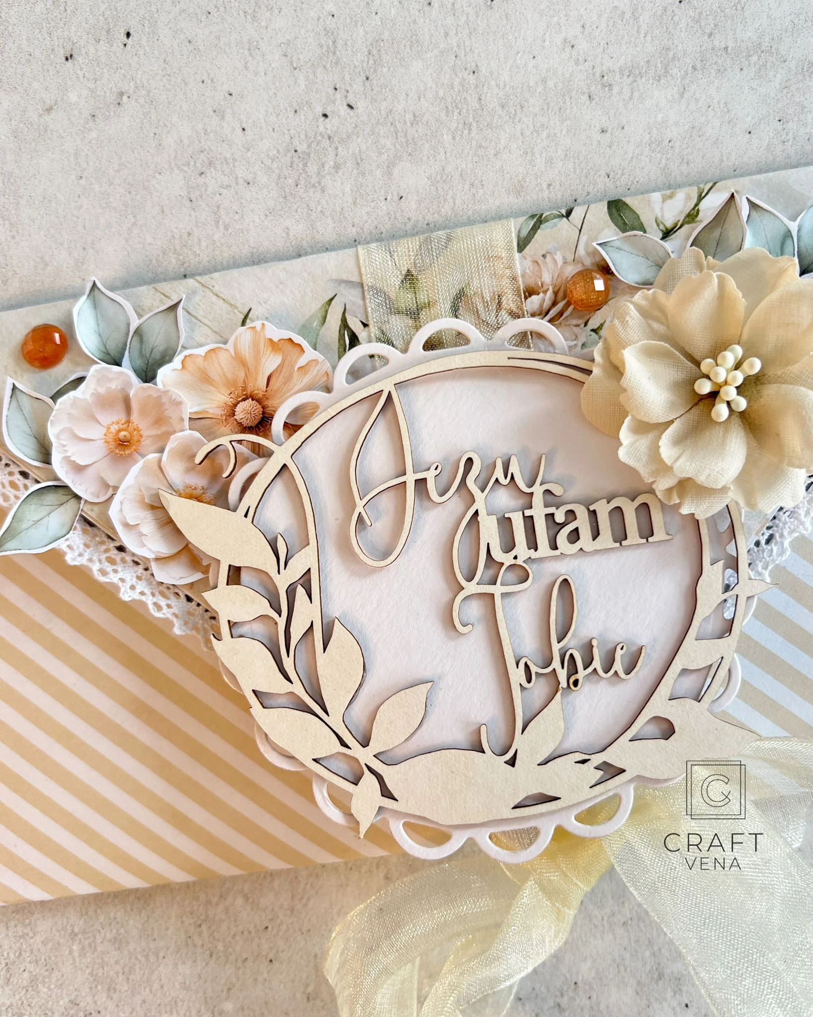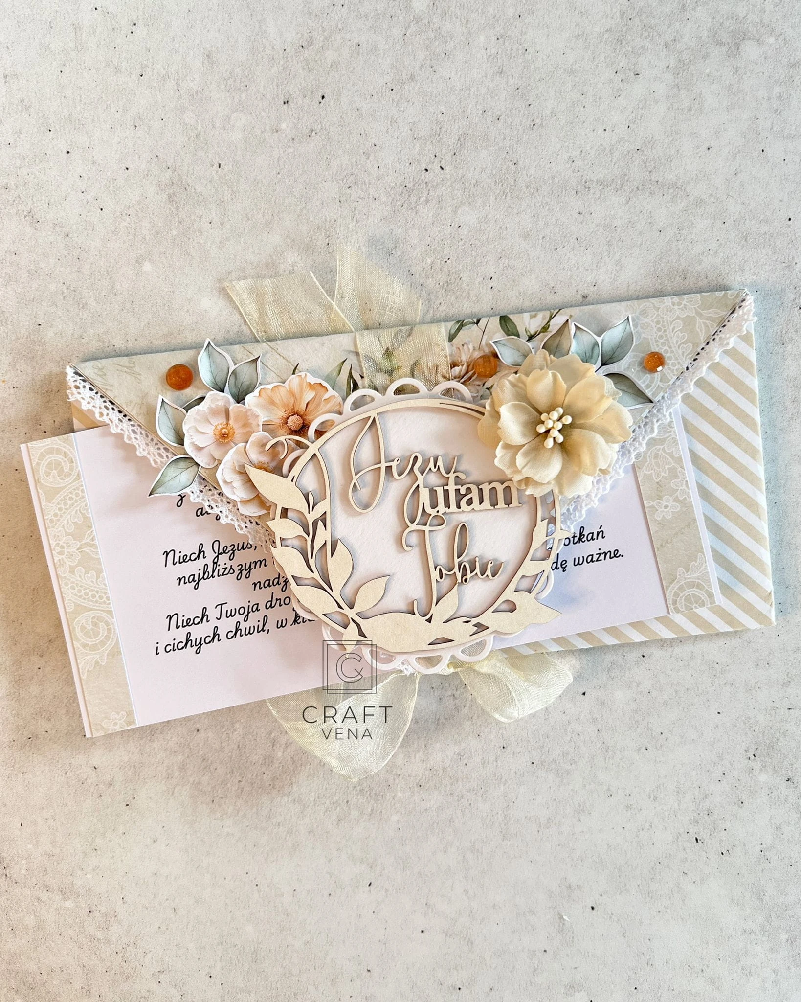 Ta kartka jest stworzona z myślą o tym, by stać się niezapomnianą pamiątką pięknego i ważnego dnia w życiu każdego chrześcijanina. Kartka zachwyca przestrzenną, bogato zdobioną kompozycją, w której każdy detal został wykonany z najwyższą starannością i miłością do rękodzieła. Do stworzenia kartki użyłam papierów premium o wysokiej gramaturze. Ozdobiłam ją ręcznie wykonanymi, trójwymiarowymi kwiatami oraz innymi elementami.