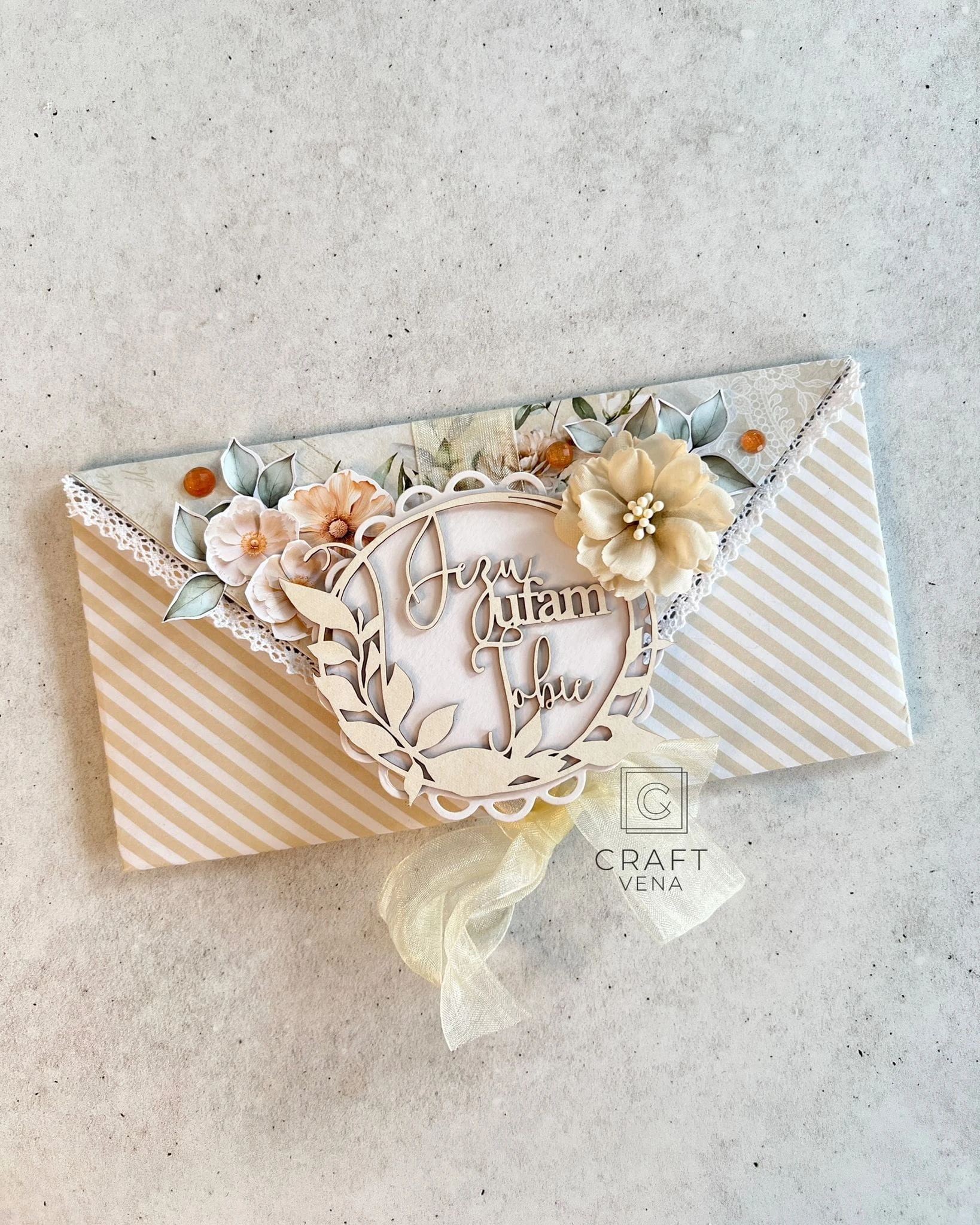 Wyjątkowa, ręcznie robiona kartka komunijna, w nietypowym formacie kopertówki. To mój autorski format, który wykonuję od wielu lat, i który cieszy się niezwykłą popularnością. Jest dla mnie charakterystyczny, niebanalny i zaskakujący.
