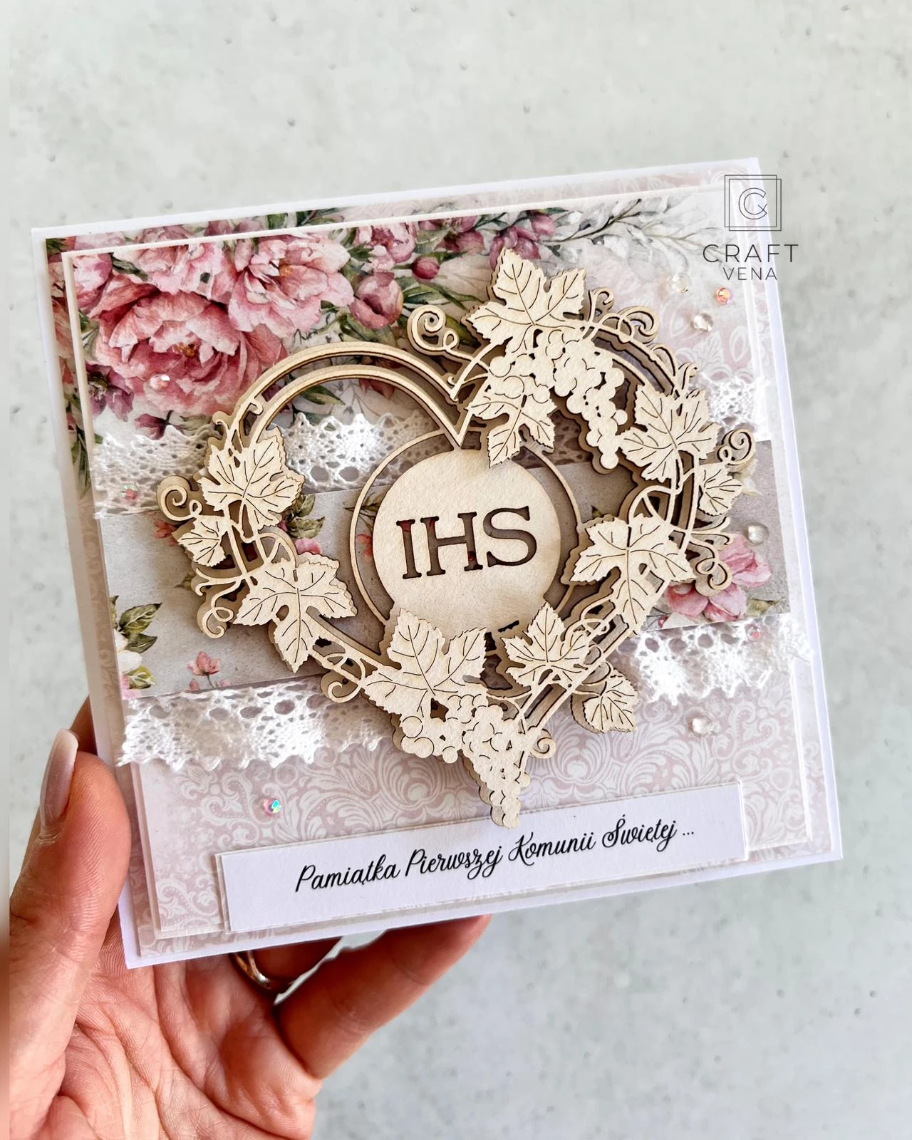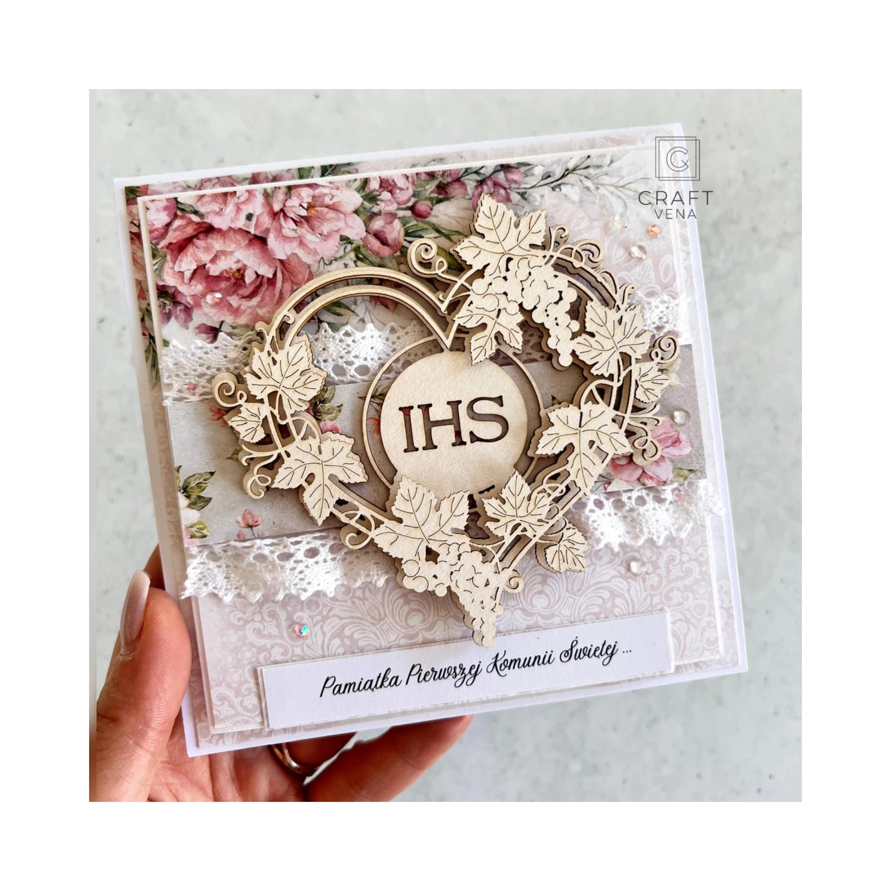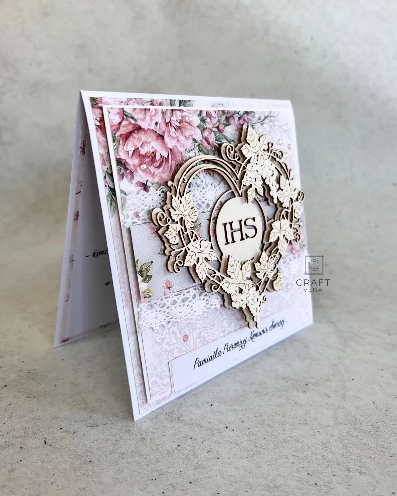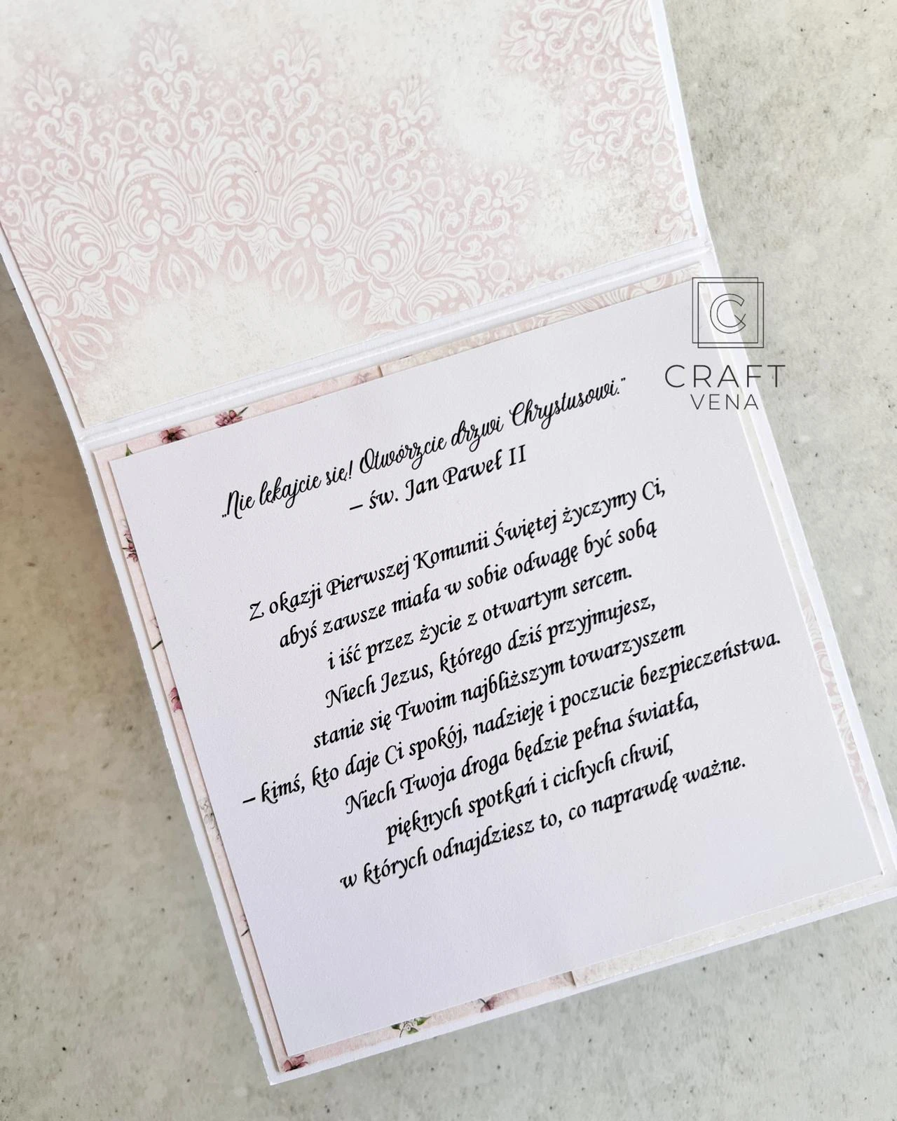 Wyjątkowa kartka okolicznościowa na pamiątkę Pierwszej Komunii Świętej w komplecie z półtransparentną kopertą. Ręcznie wykonana pamiątka, która zachwyca detalami i podkreśla wyjątkowość ważnych chwil.