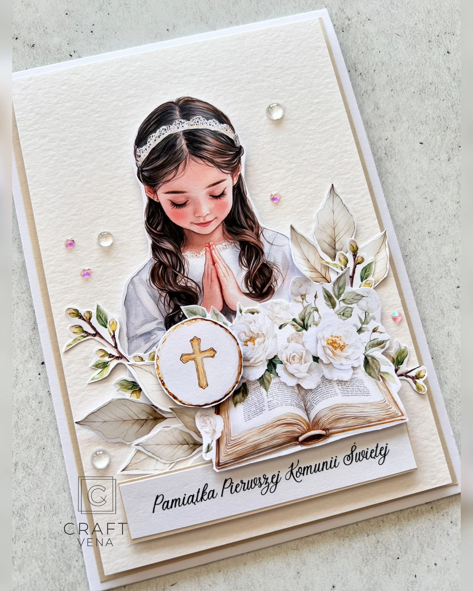 Ręcznie wykonana, elegancka kartka na Pierwszą Komunię Świętą w stylu clean&simple. Delikatna kompozycja warstwowa, subtelne kryształki oraz miejsce na życzenia w środku. kartka jest otwierana, można ją postawić na biurku lub szafce.