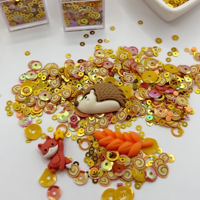 ➡️ Ten zestaw, to zestaw duży, zawiera mix elementów w kolorze złotym, jasnym czerwonym, żółtym i pomarańczowym, w opakowaniu o pojemności 22 ml. Zestaw inspirowany jabłkowymi sadami, z wędrującym jeżykiem, a także polską jesienią. Jest niezwykle uniwersalny, idealny, aby udekorować Twoje projekty i dodać im wyjątkowego charakteru. W środku są trzy duże elementy: jeż, lis i liść, widoczne na zdjęciu.