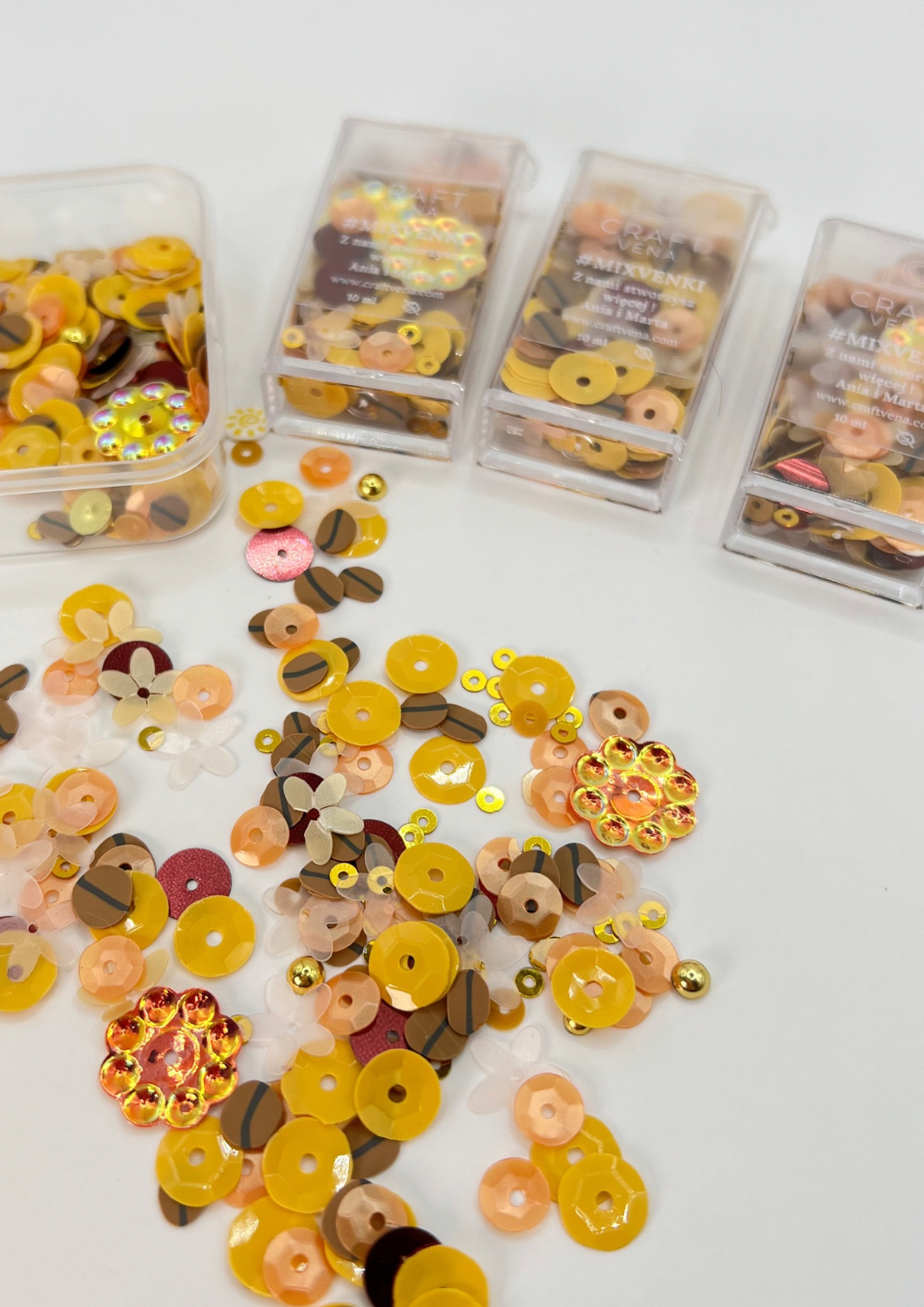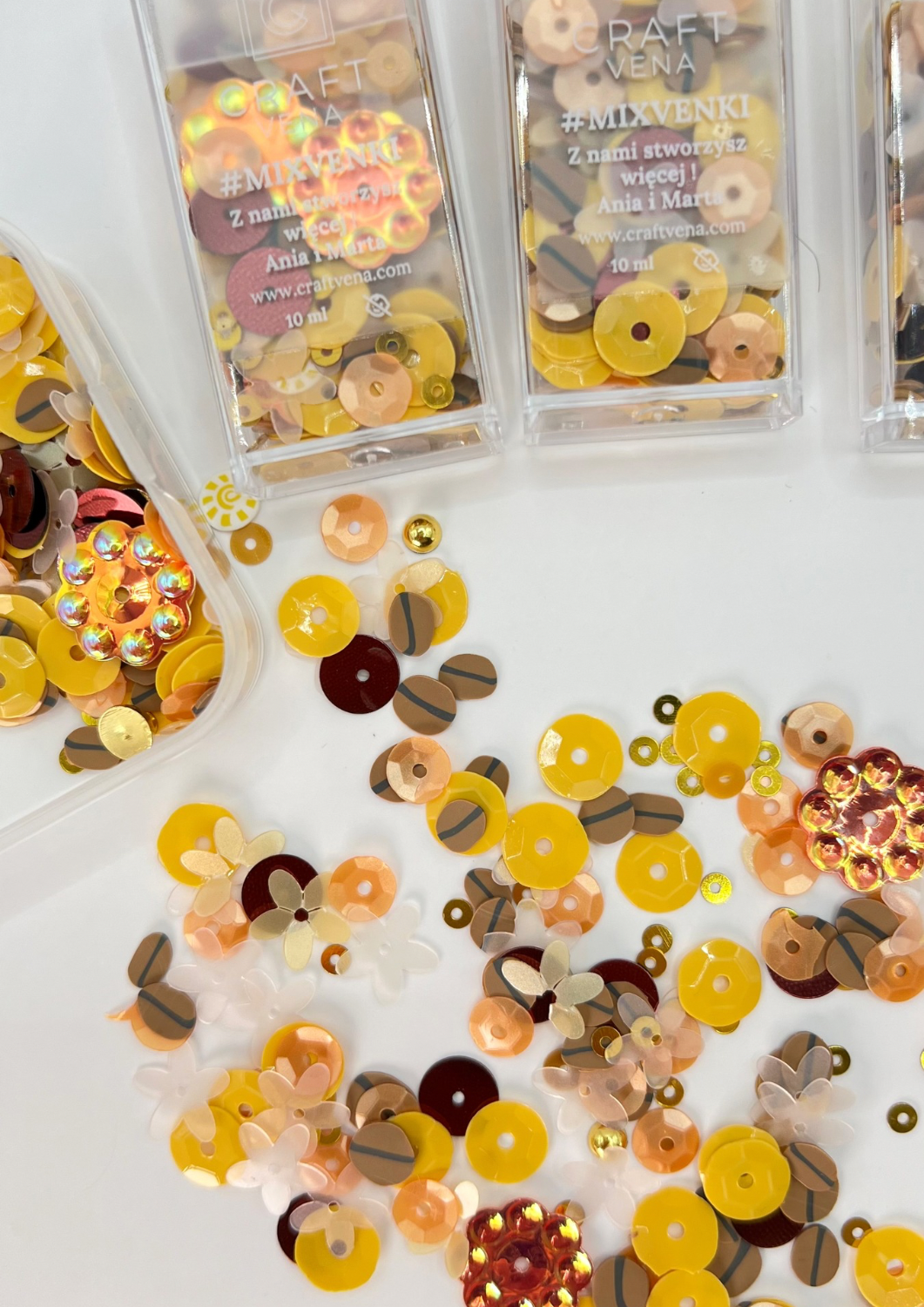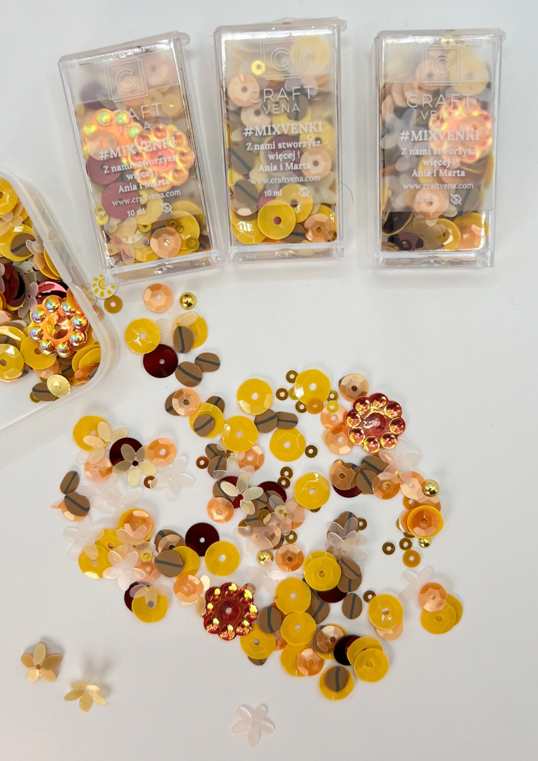 Mixvenki to autorskie mieszanki ozdobne stworzone przez Craftvena. W każdym opakowaniu znajdziesz starannie dobrany zestaw cekinów, drobnych elementów dekoracyjnych, a czasem także pereł i kryształków. Dzięki temu Mixvenki pięknie mienią się w świetle i dodają projektom lekkości, blasku oraz wyjątkowego charakteru. To wyjątkowy produkt stworzony z myślą o osobach, które kochają kreatywne rękodzieło i journaling.