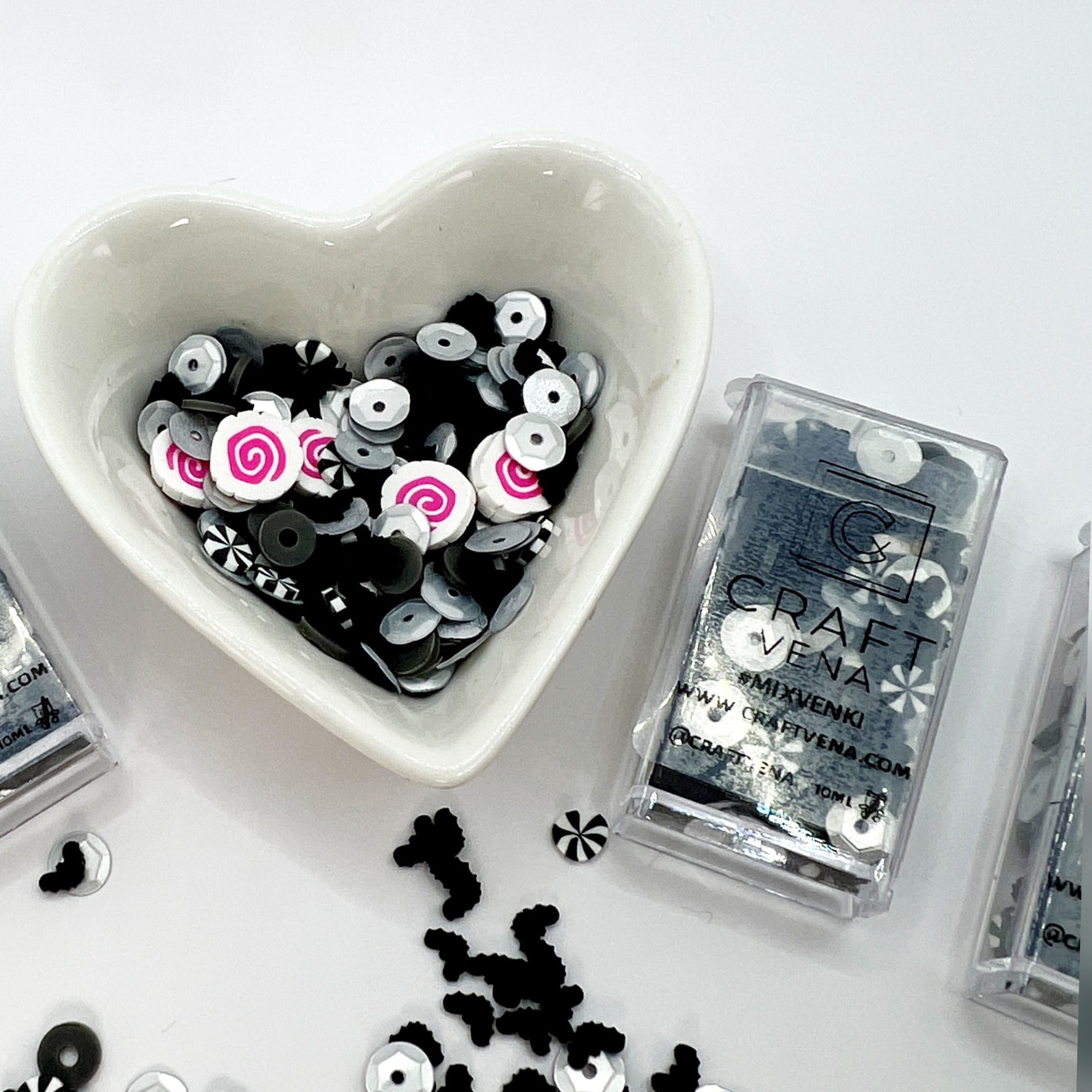 ➡️ Ten zestaw, to zestaw mały, zawiera mix elementów w odcieniach czerni, srebra, bieli i intensywnego różu, w opakowaniu o pojemności 10 ml. Zestaw inspirowany blaskiem księżyca. Jest niezwykle uniwersalny, idealny, aby udekorować Twoje projekty i dodać im wyjątkowego charakteru.
