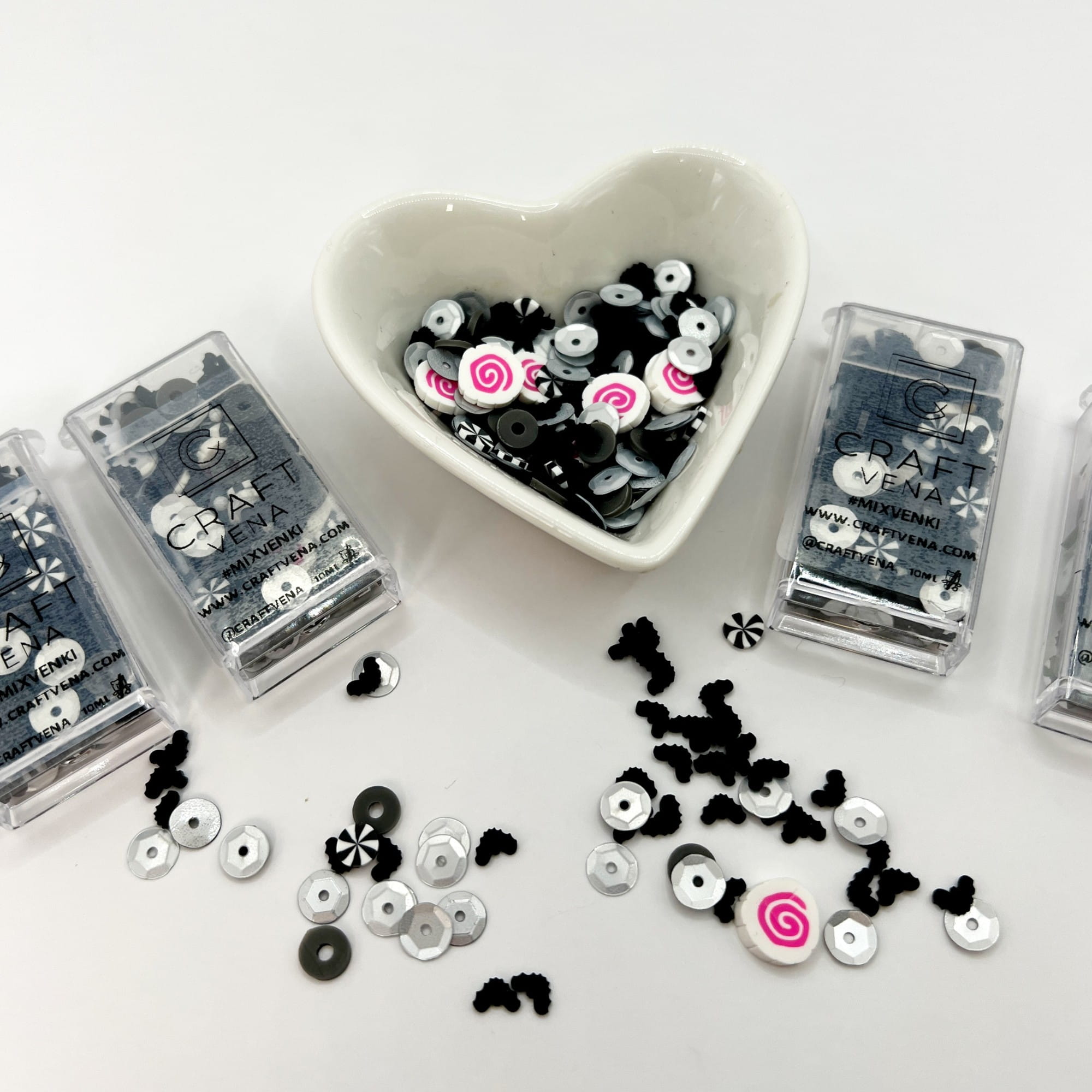 Mixvenki to autorskie mieszanki ozdobne stworzone przez Craftvena. W każdym opakowaniu znajdziesz starannie dobrany zestaw cekinów, drobnych elementów dekoracyjnych, a czasem także pereł i kryształków. Dzięki temu Mixvenki pięknie mienią się w świetle i dodają projektom lekkości, blasku oraz wyjątkowego charakteru. To wyjątkowy produkt stworzony z myślą o osobach, które kochają kreatywne rękodzieło i journaling.