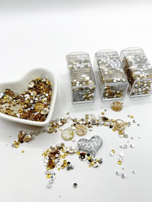 Ten zestaw duży, zawiera odcieniach złotego, szampańskiego złota i srebra, w opakowaniu o pojemności 22 ml. Zestaw inspirowany Nowym Rokiem i blaskiem szlachetnych kamieni. Jest elegancki i wyjątkowy, idealny, aby udekorować Twoje projekty i dodać im oryginalnego charakteru. W środku jest jedno srebrne, duże serce ze srebrnym brokatem, oraz kabaszony z zatopionymi płatkami złota, widoczne na zdjęciu.