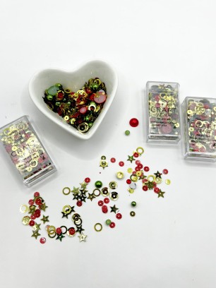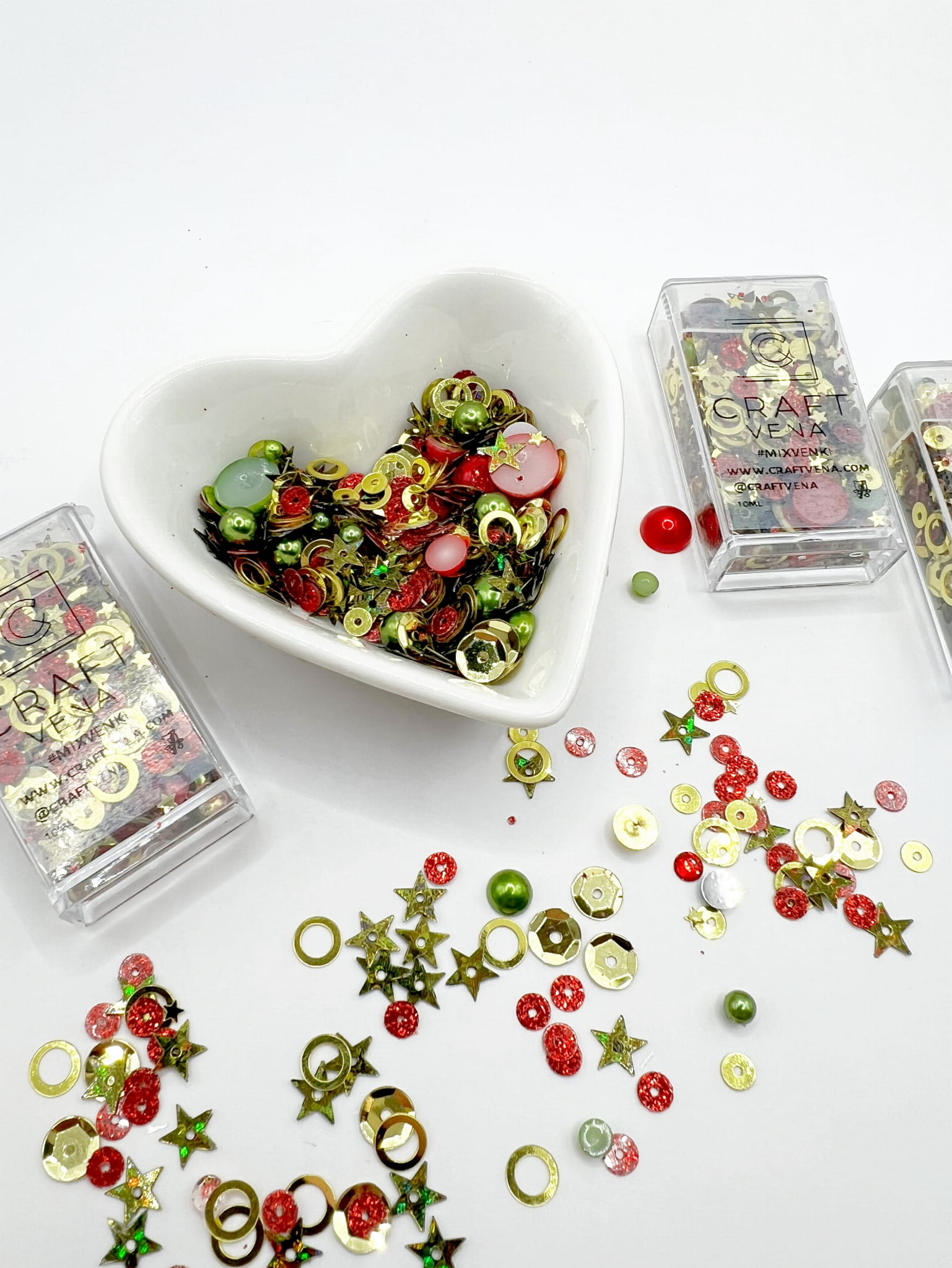 Mieszanka cekinów i drobnych elementów dekoracyjnych. Zestaw świąteczny, na Boże Narodzenie. Mixvenki są idealne do kartek, exploding boxów, shakerów, journalingu i innych projektów rękodzielniczych. Pojemność 10 ml. Kolory tego zestawu: czerwony, zielony, złoty.
