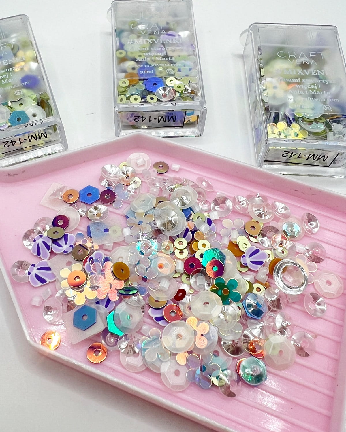 Mixvenki to autorskie mieszanki ozdobne stworzone przez Craftvena. W każdym opakowaniu znajdziesz starannie dobrany zestaw cekinów, drobnych elementów dekoracyjnych, a czasem także pereł i kryształków. Dzięki temu Mixvenki pięknie mienią się w świetle i dodają projektom lekkości, blasku oraz wyjątkowego charakteru. To wyjątkowy produkt stworzony z myślą o osobach, które kochają kreatywne rękodzieło i journaling.