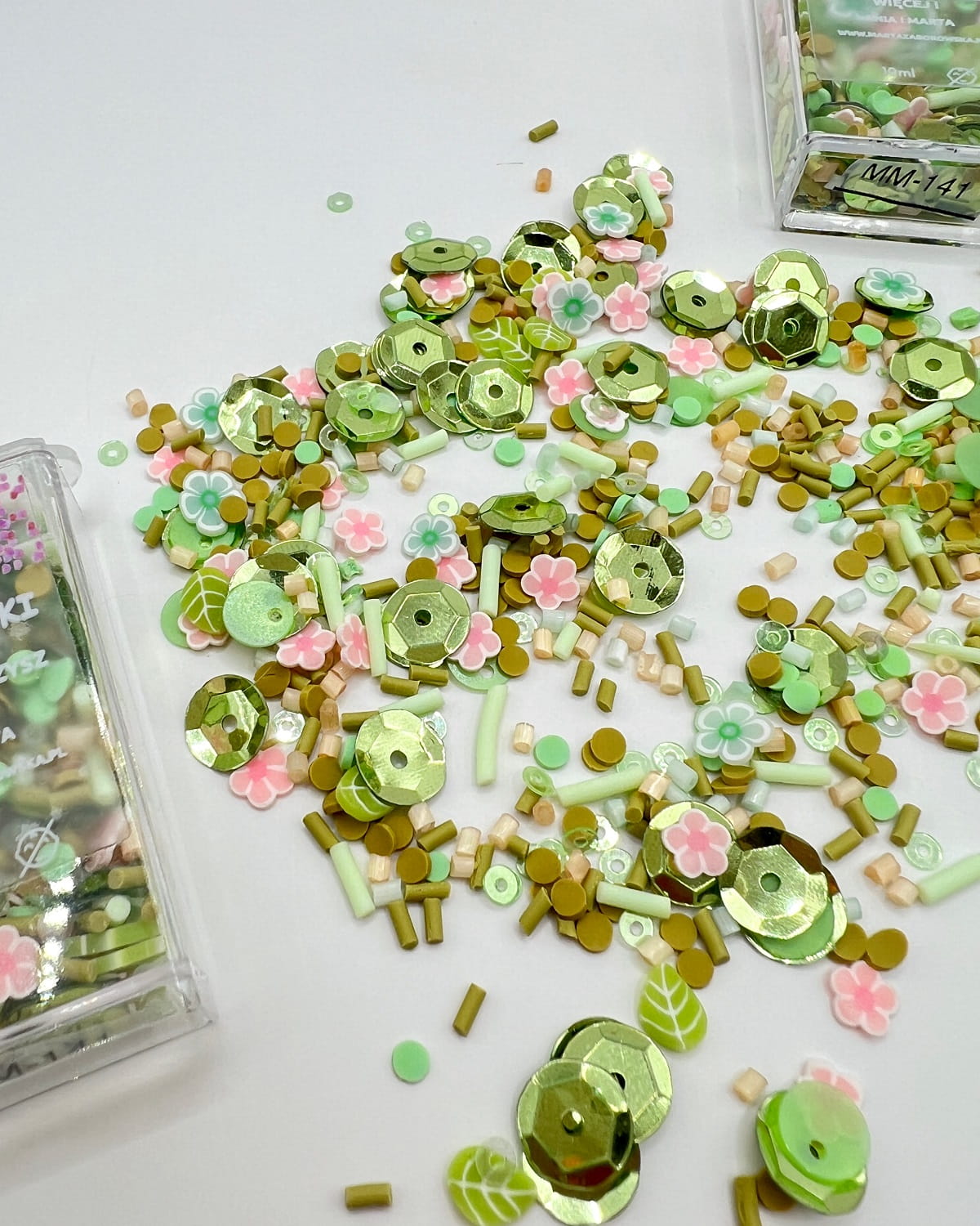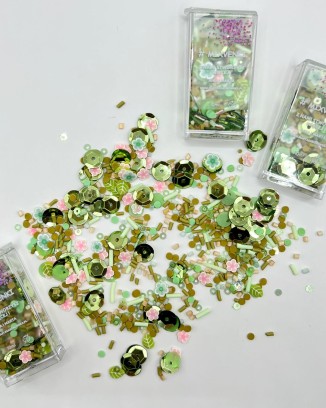 Zielona mieszanka cekinów i drobnych elementów dekoracyjnych z subtelnymi motywami kwiatów i liści. Uniwersalne Mixvenki idealne do kartek, exploding boxów, shakerów, journalingu i innych projektów rękodzielniczych. Pojemność 10 ml.