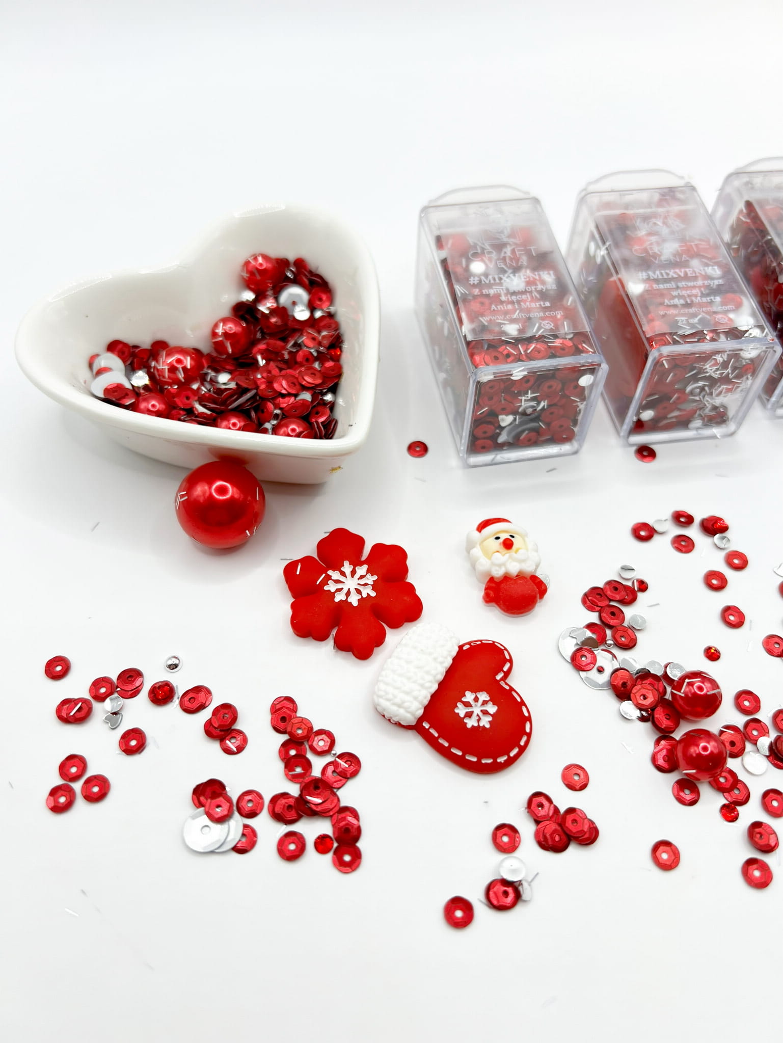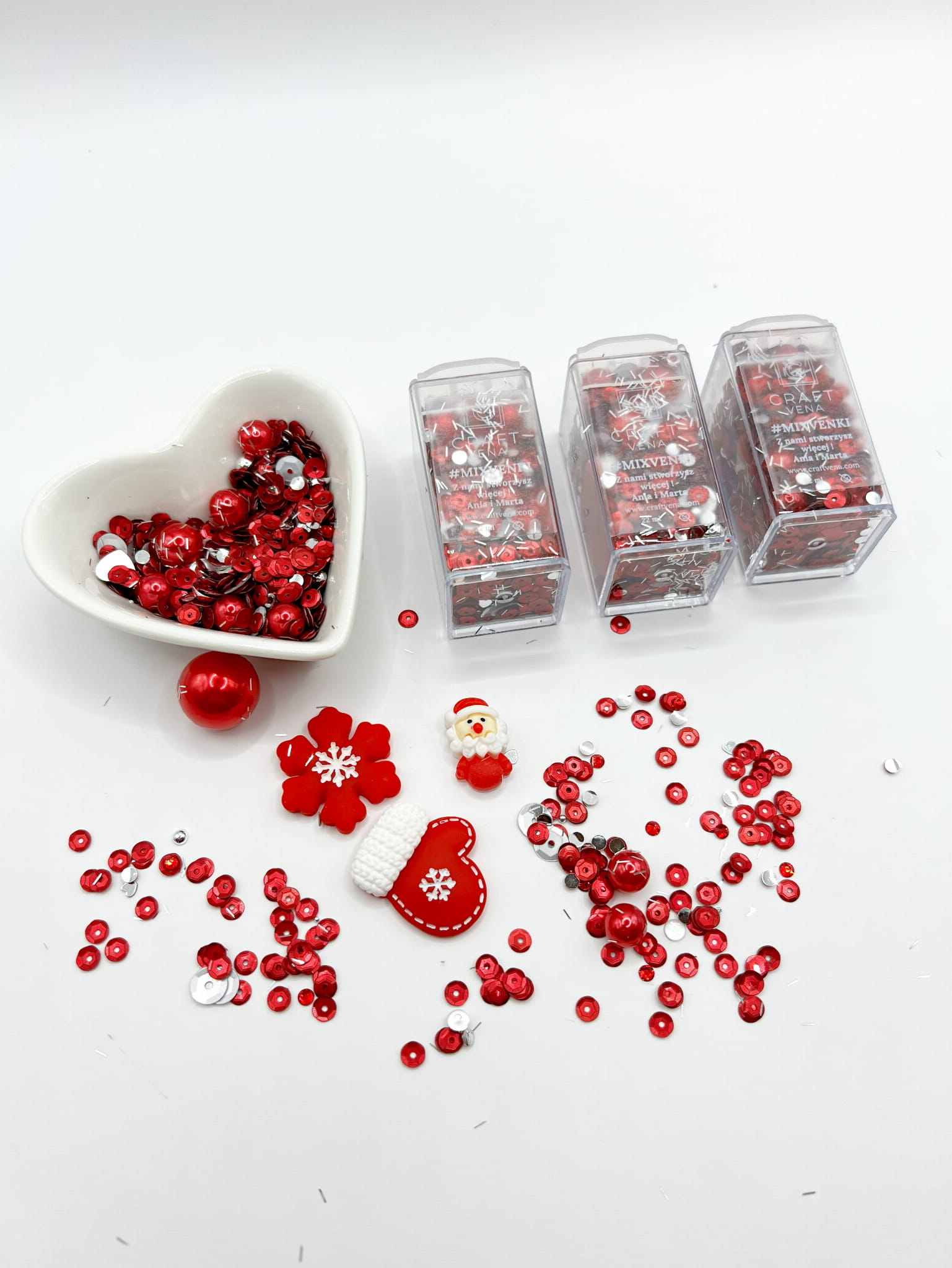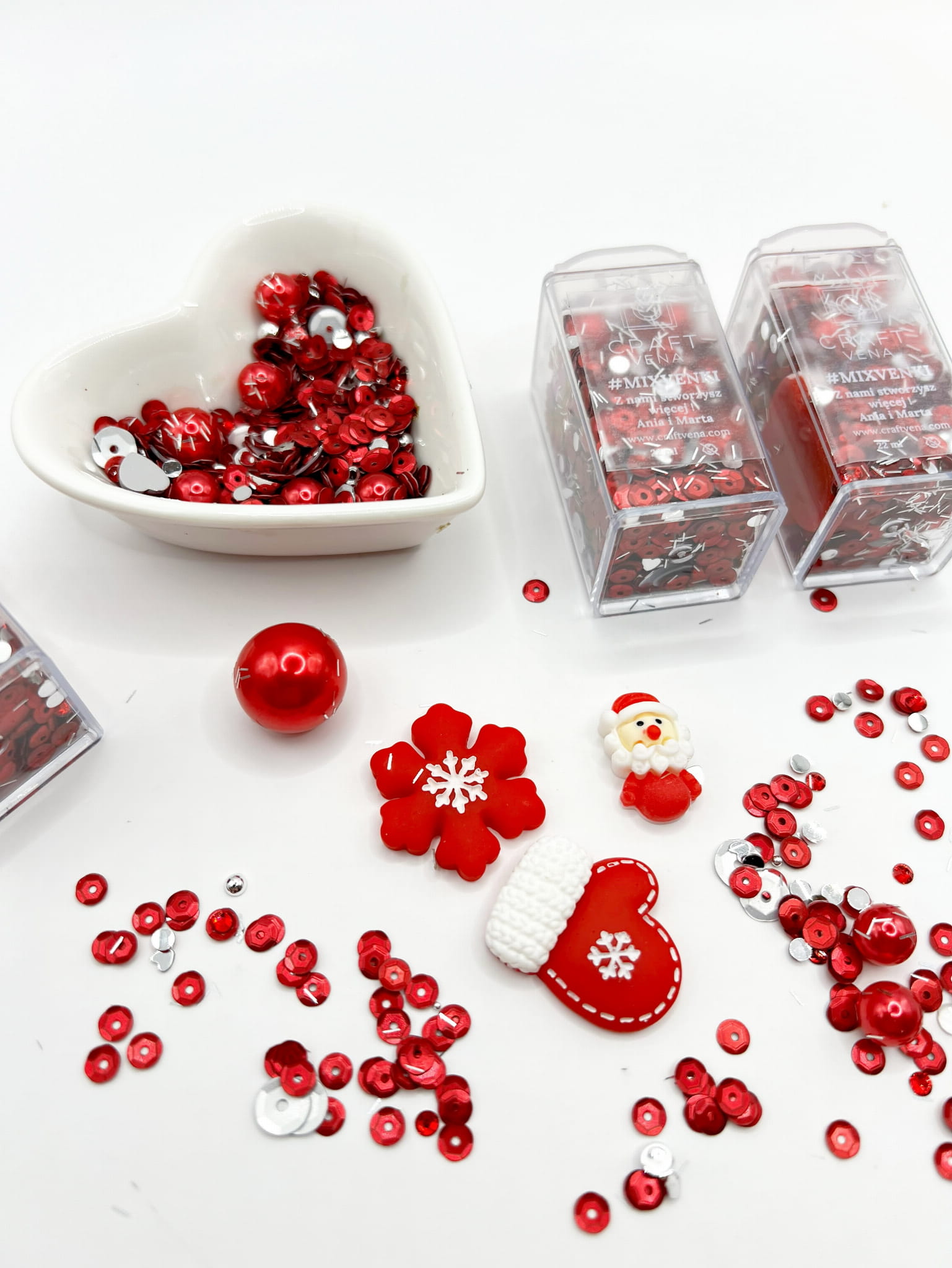 Ten zestaw duży, zawiera odcieniach czerwonego i srebrnego, w opakowaniu o pojemności 22 ml. Zestaw inspirowany świętami Bożego Narodzenia. Jest wyjątkowy, idealny, aby udekorować Twoje projekty i dodać im świątecznego charakteru. W środku są 4 duże elementy z tworzywa: rękawiczka, poinsecja, mikołaj oraz duża perła, widoczne na zdjęciu.