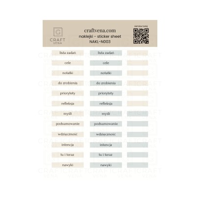 Arkusz naklejek z napisami - hasłami do planowania i journalingu, oraz elementami dekoracyjnymi w kolorach beżu i jasnego niebieskiego. Papier matowy, certyfikowany, produkcja w Polsce.