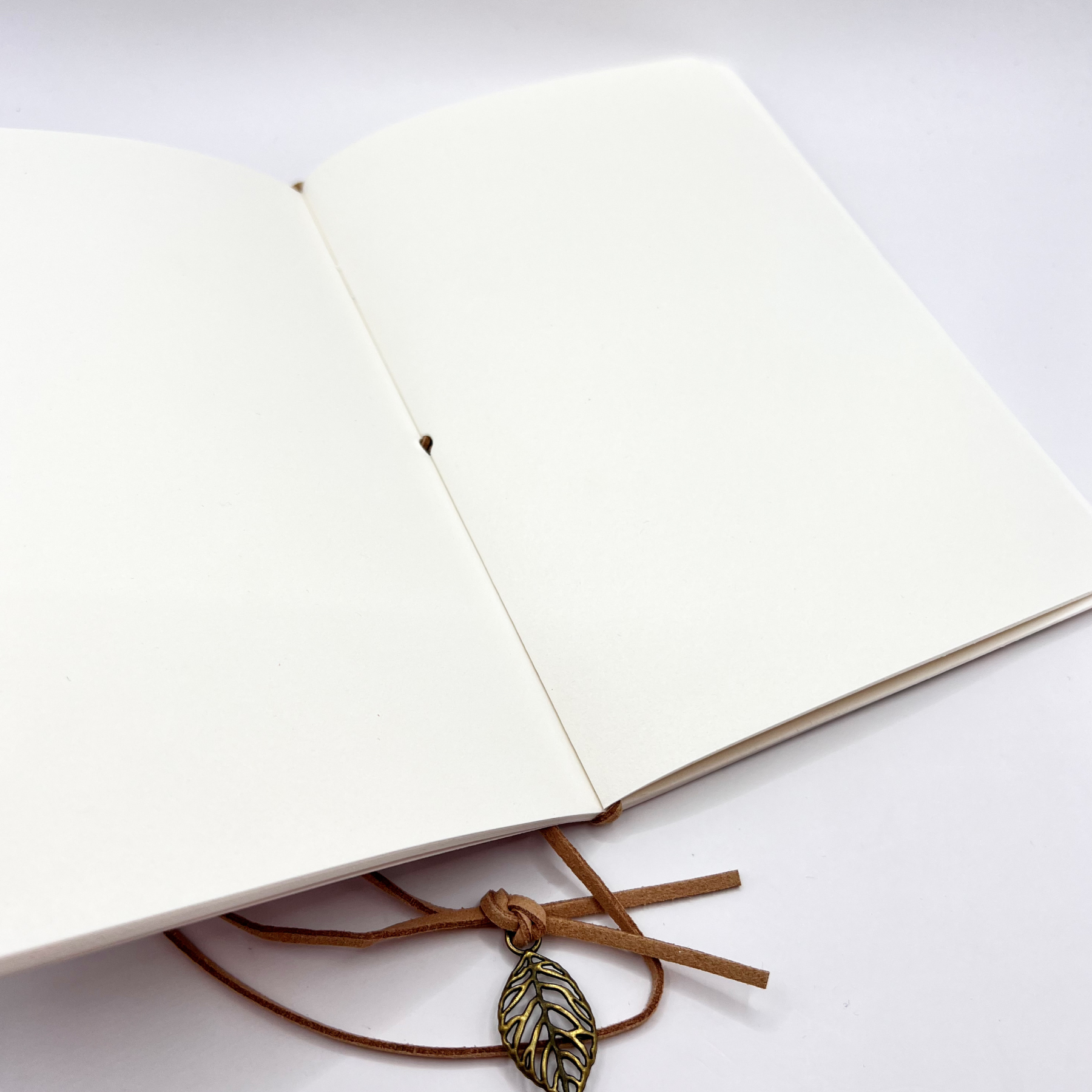 Delikatny notes w stylu vintage z miękką, fakturowaną okładką i papierem w odcieniu złamanej bieli. Związany ozdobnym rzemykiem z zawieszką w kształcie listka, idealny do journalingu, refleksji i zapisków tworzonych w rytmie slow.